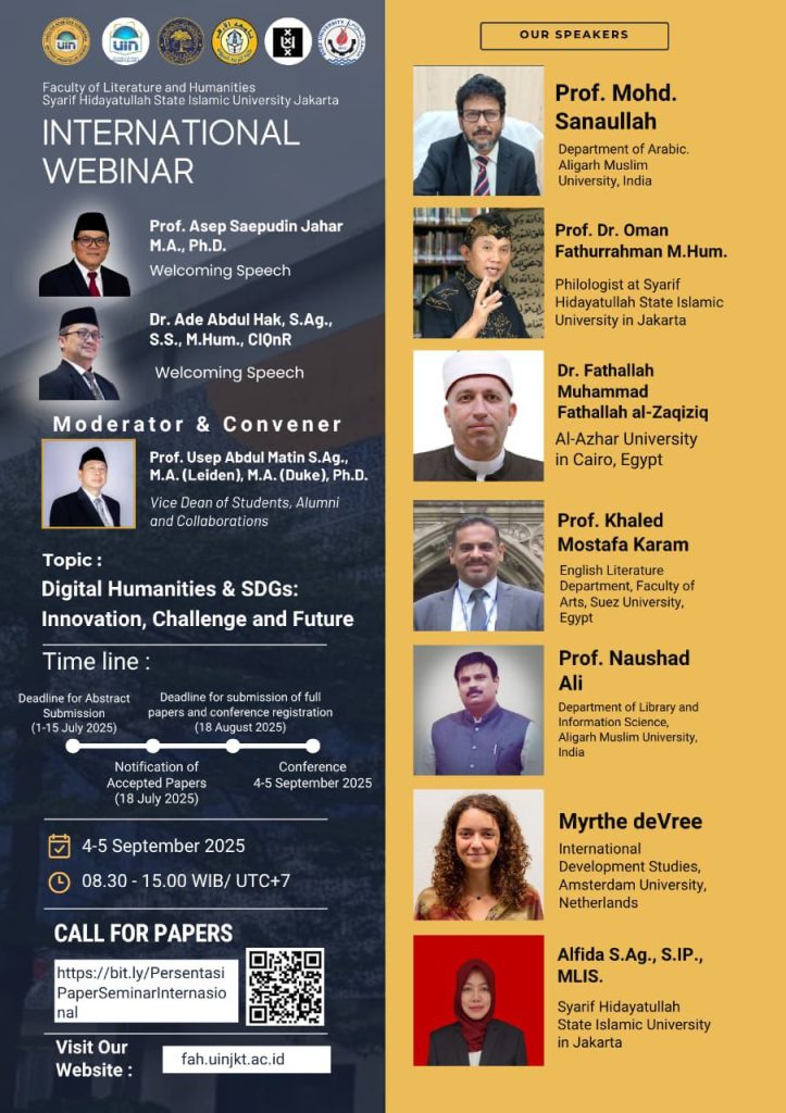 Webinar internasional yang mengusung tema “Digital Humanities and SDGs: Innovation, Challenge and the Future” ini mempertemukan para peneliti, dosen, dan mahasiswa dari berbagai perguruan tinggi, baik dari dalam maupun luar negeri, untuk mendiskusikan peran digital humanities dalam mendukung pencapaian Sustainable Development Goals (SDGs).