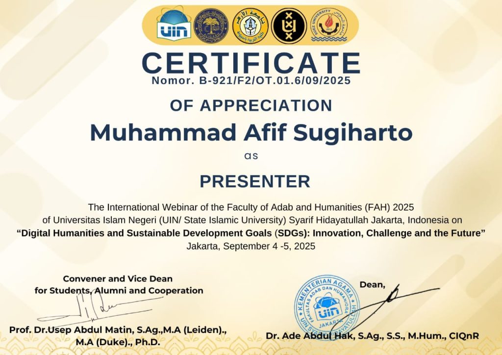 1. Muhammad Afif Sugiharto (PAI), dengan artikel berjudul “Digital Humanities in Islamic Education: Strengthening Values Internalization toward SDG’s 4 (Quality Education)”, dibimbing oleh Dr. Rivai Bolotio, M.Pd.