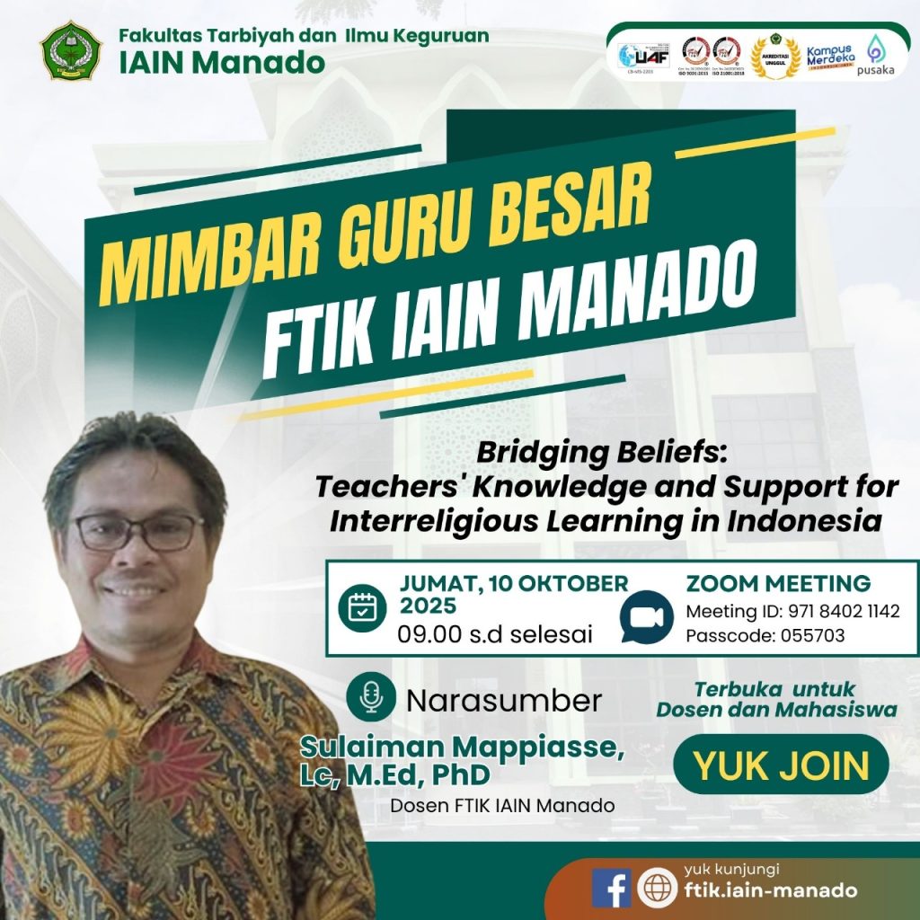 FTIK IAIN Manado – Fakultas Tarbiyah dan Ilmu Keguruan (FTIK) IAIN Manado kembali menggelar kegiatan rutin Mimbar Guru Besar, sebagai forum akademik yang menjadi wadah diskusi ilmiah dan refleksi atas isu-isu pendidikan kontemporer. Dalam edisi Jumat, 11 Oktober kali ini menghadirkan paparan hasil riset terbaru dari dosen FTIK, Sulaiman Mappiasse, Ph.D, berjudul “Bridging Beliefs: Teachers’ Knowledge and Support for Interreligious Learning in Indonesia.” Kegiatan ini dipandu langsung oleh Dekan FTIK Dr. Arhanuddin, M.Pd.I.